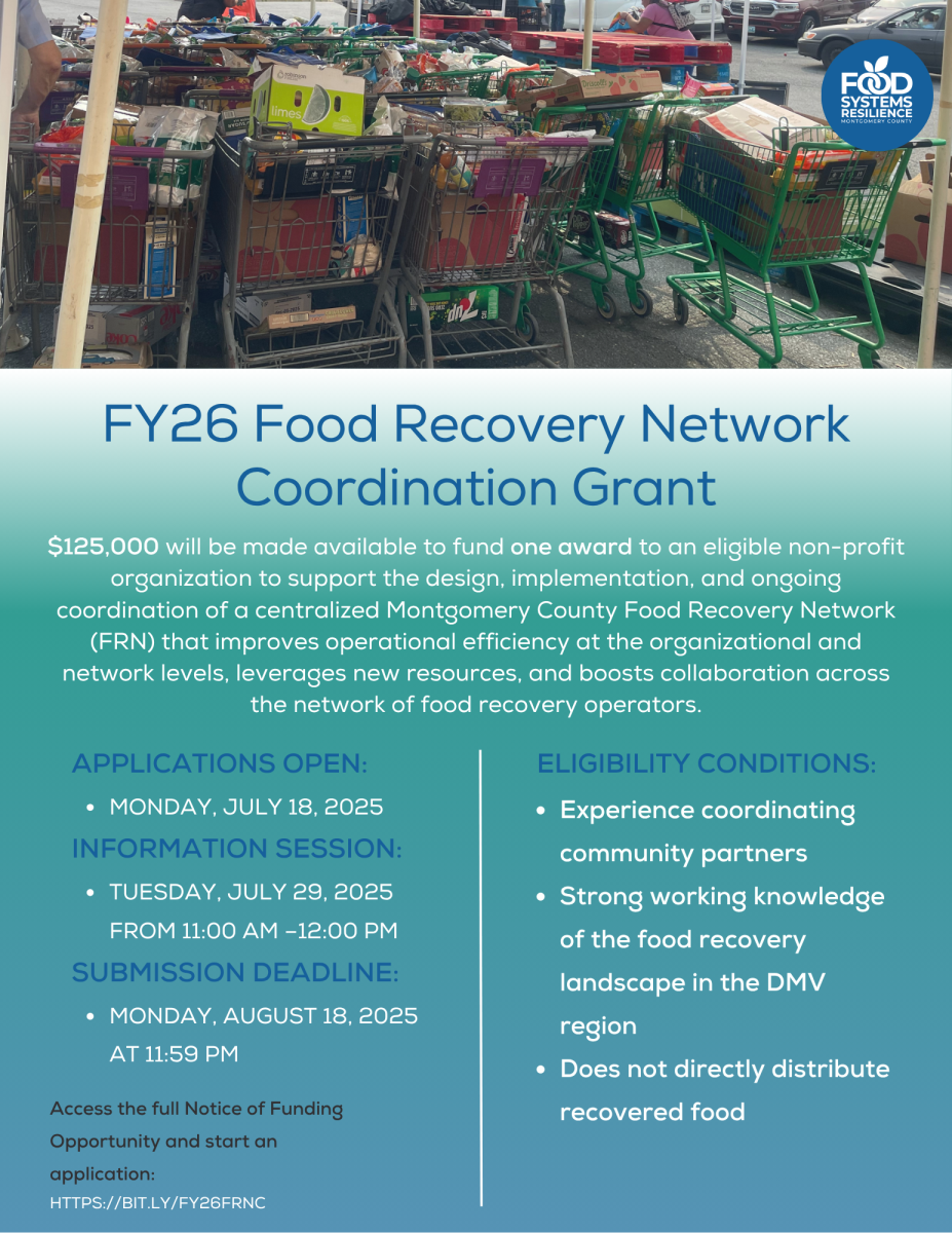 $125,000 is available to fund one award to an eligible non-profit organization to support the design, implementation, and ongoing coordination of a centralized Montgomery County Food Recovery Network (FRN) that improves operational efficiency at the organizational and network levels, leverages new resources, and boosts collaboration across the network of food recovery operators.