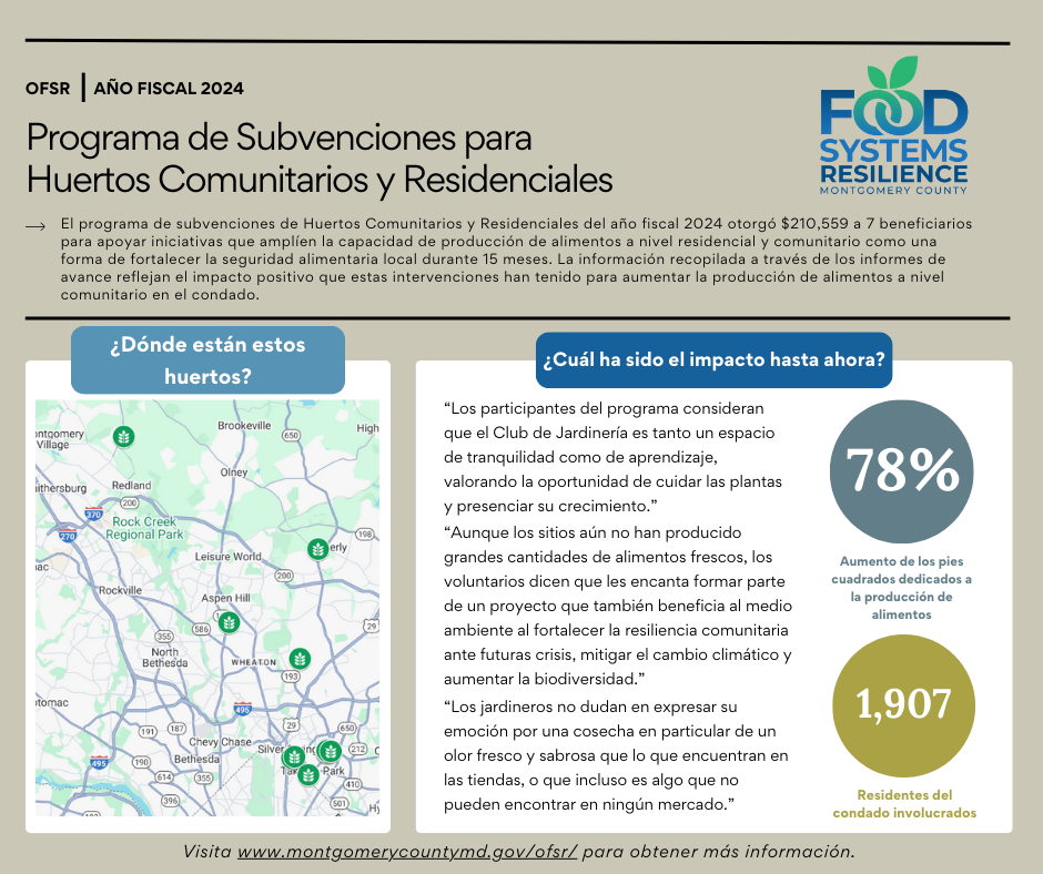 The FY24 Resident and Community Gardening Grant Program has supported seven grantees to expand food production and education across Montgomery County. We’ve seen a 78% increase in food-growing space and engaged 1,907 residents to date.