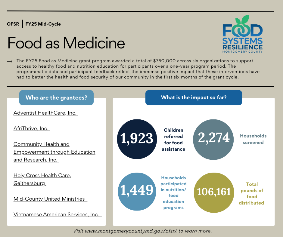 The Office of Food Systems Resilience (OFSR) and the Office of Grants Management (OGM) are soliciting applications for the FY 2026 Food as Medicine Grant Program. $750,000 in total grant funding will be available to support healthcare and clinic-led Food as Medicine programs that increase access to culturally diverse, medically-relevant, nutritious, and locally produced food for Montgomery County households screening positive for food insecurity that include at least one child aged 0-18 and include a parent and/or child who have a current diagnosis of diet-related disease.