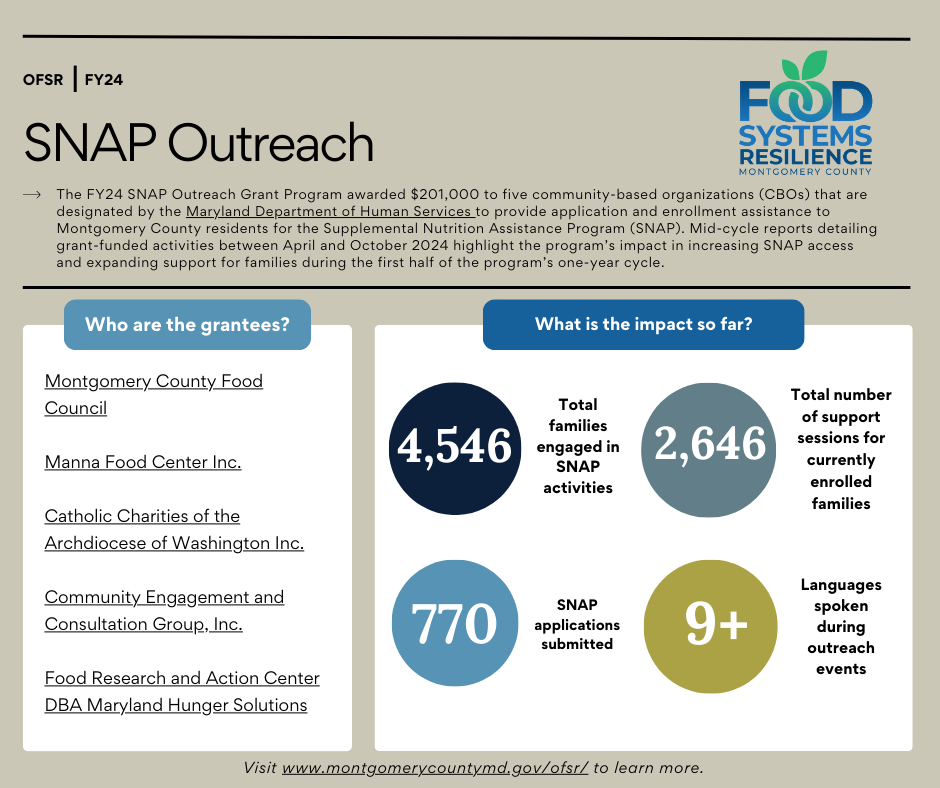 The FY25 Nutrition Benefits Outreach Grant Program has awarded $304,000 to six state-designated SNAP CBOs to implement innovative approaches to reach and provide enrollment support to Montgomery County families that are eligible, but not actively enrolled, in SNAP and other federal and state-level nutrition benefits programs. The list of grantees can be found below.