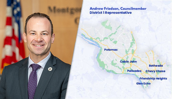 Councilmember Andrew Friedson represents District 1, which includes Bethesda, Cabin John, Chevy Chase, Friendship Heights and Palisades, Glen Echo and Potomac. Andrew chairs the Planning, Housing, & Parks (PH) Committee and serves on the Government Operations & Fiscal Policy (GO) Committee.