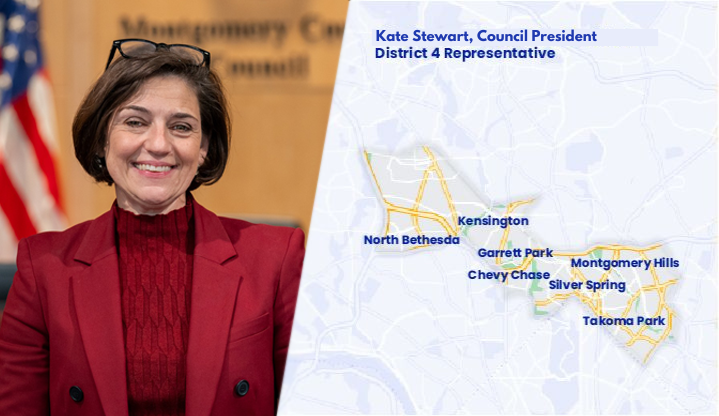 Council President Kate Stewart represents District 4, which includes Takoma Park, Silver Spring, Montgomery Hills, Kensington, Garrett Park, and parts of Chevy Chase and North Bethesda. She chairs the Government Operations and Fiscal Policy and Audit committees and sits on the Transportation and Environment committee.