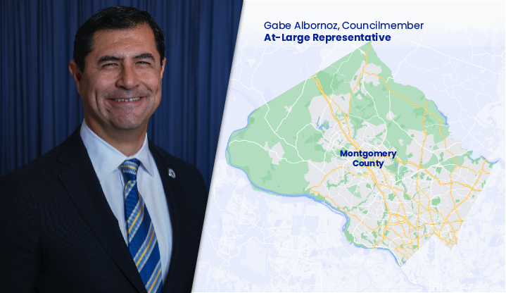 Councilmember Gabe Albornoz is one of four at-large members of the Montgomery County Council, elected by voters from across the entire County. Gabe is Chair of the Council’s Health and Human Services Committee and a member of the Education and Culture Committee.