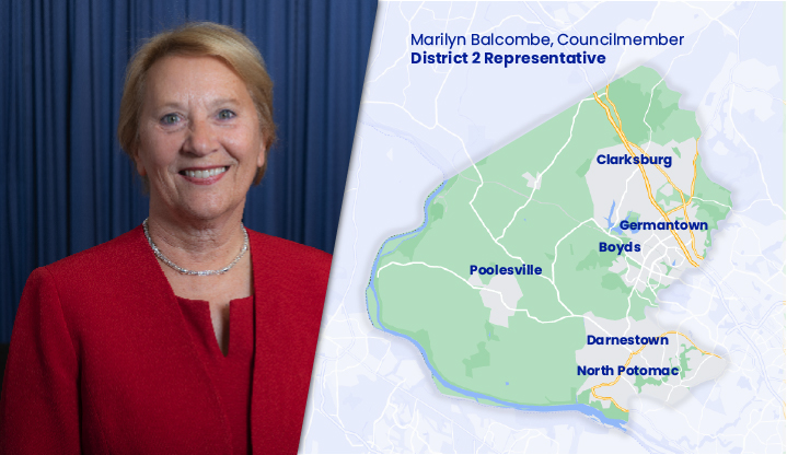 Councilmember Marilyn Balcombe represents District 2, which includes Germantown, Clarksburg, Poolesville, Boyds, North Potomac and Darnestown. Marilyn is a member of the Council’s Economic Development Committee and the Transportation and Environment Committee.