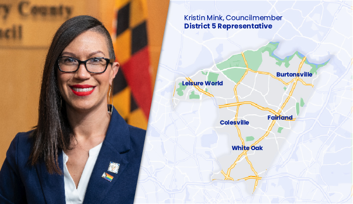 Councilmember Kristin Mink represents District 5, which includes Burtonsville, Colesville, Fairland, White Oak, and Leisure World. Kristin is a member of the Council’s Public Safety Committee and the Education and Culture Committee.