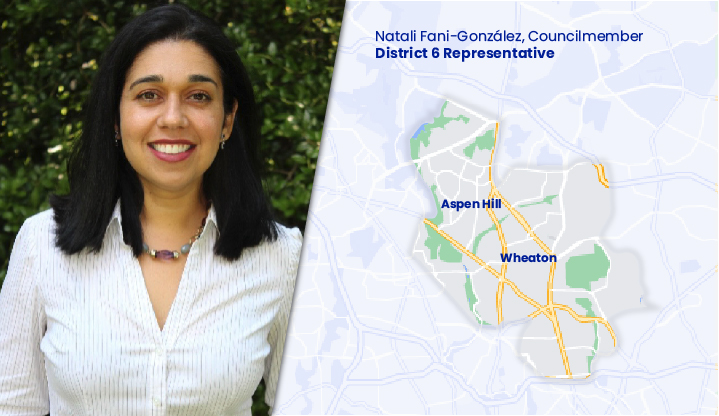 Councilmember Natali Fani-González represents District 6, which includes Wheaton and Aspen Hill. Natali is Chair of the Council’s Economic Development Committee and a member of the Planning, Housing and Parks Committee.