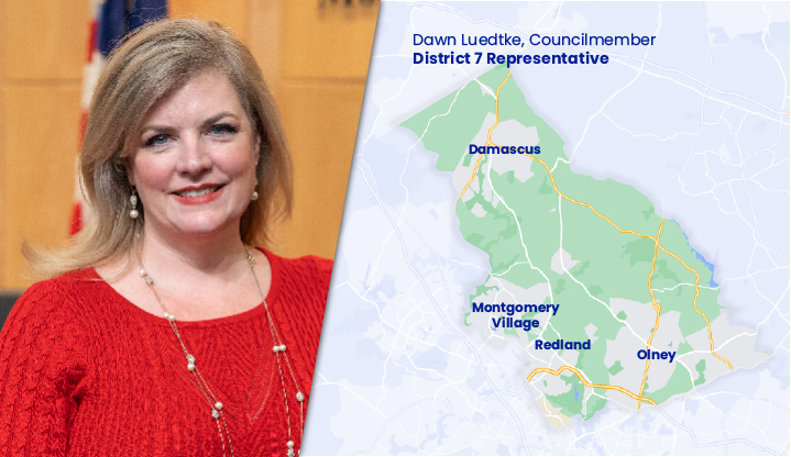 Councilmember Dawn Luedtke represents District 7, which includes the areas between Olney and Damascus in northern Montgomery County. Dawn is a member of the Council’s Public Safety Committee and the Health and Human Services Committee.