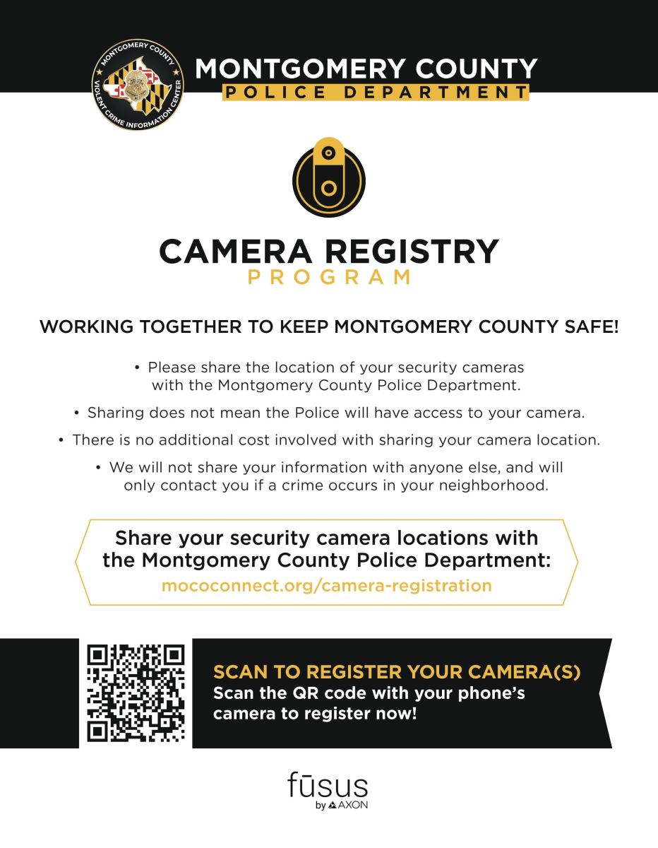 The Montgomery County Department of Police is committed to working in partnership with the community and has launched a Police-Private Security Camera Incentive Program to deter and solve crime by incentivizing the installation of security cameras in geographic areas experiencing relatively high crime rates. Beginning November 15, 2023, an owner or tenant of a property that is used as a residence, business, or nonprofit organization located within an eligible priority area may apply.