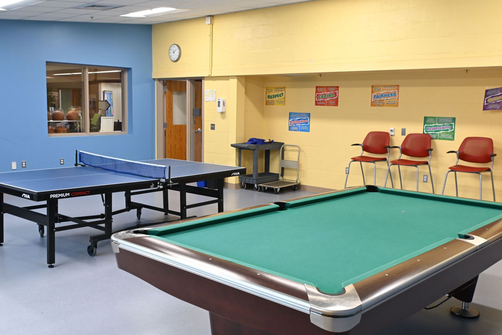 Outdoor facilities include a multi-age playground, open non-regulation ball field, and full length outdoor basketball courts. The grounds can be rented for family picnics or other outdoor events.