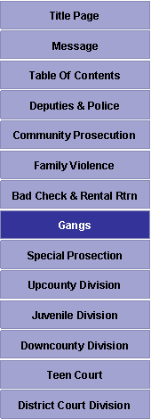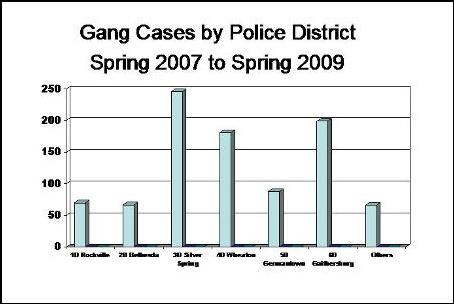 This office has made gang-related violence a priority. Gangs are a serious problem in Montgomery County, but State’s Attorney McCarthy has made significant progress against them by establishing an organized protocol for dealing with these cases. The Gang Prosecution Unit handles all gang-related cases from start to finish – no matter how serious or trivial the offense, no matter how young or old the offender. This specialized unit works closely with other agencies to identify gang cases and take them from charging through trial to sentencing. It focuses on prevention and intervention. The Gang Prosecution Unit handles not just violent crime, but all cases in which a known gang member has been charged. The unit handled 377 cases in 2008, ranging from telephone misuse to homicide. Team members prosecuted 137 of those cases in Circuit Court, 171 in District Court, and 69 in Juvenile Court. Fourteen cases involved female defendants, and the remaining 363 prosecutions involved males. Of the six geographic police districts, the most prosecutions came out of the third district (Silver Spring – 115 cases), and the fewest derived from the first district (Rockville – 24 cases). The State of Maryland defines a criminal gang as a group or ongoing association of three or more persons whose members: (1) individually or collectively engage in a pattern of criminal gang activity; (2) have as one of their primary objectives or activities the commission of one or more underlying crimes, including acts by juveniles that would be underlying crimes if committed by adults; and (3) have in common an identifying sign, symbol, name, leader, or purpose.