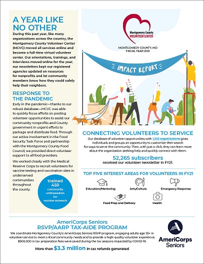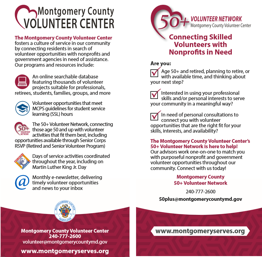 The Volunteer Center strives to promote and expand meaningful community service in Montgomery County by recruiting, supporting, and connecting volunteers and nonprofits.