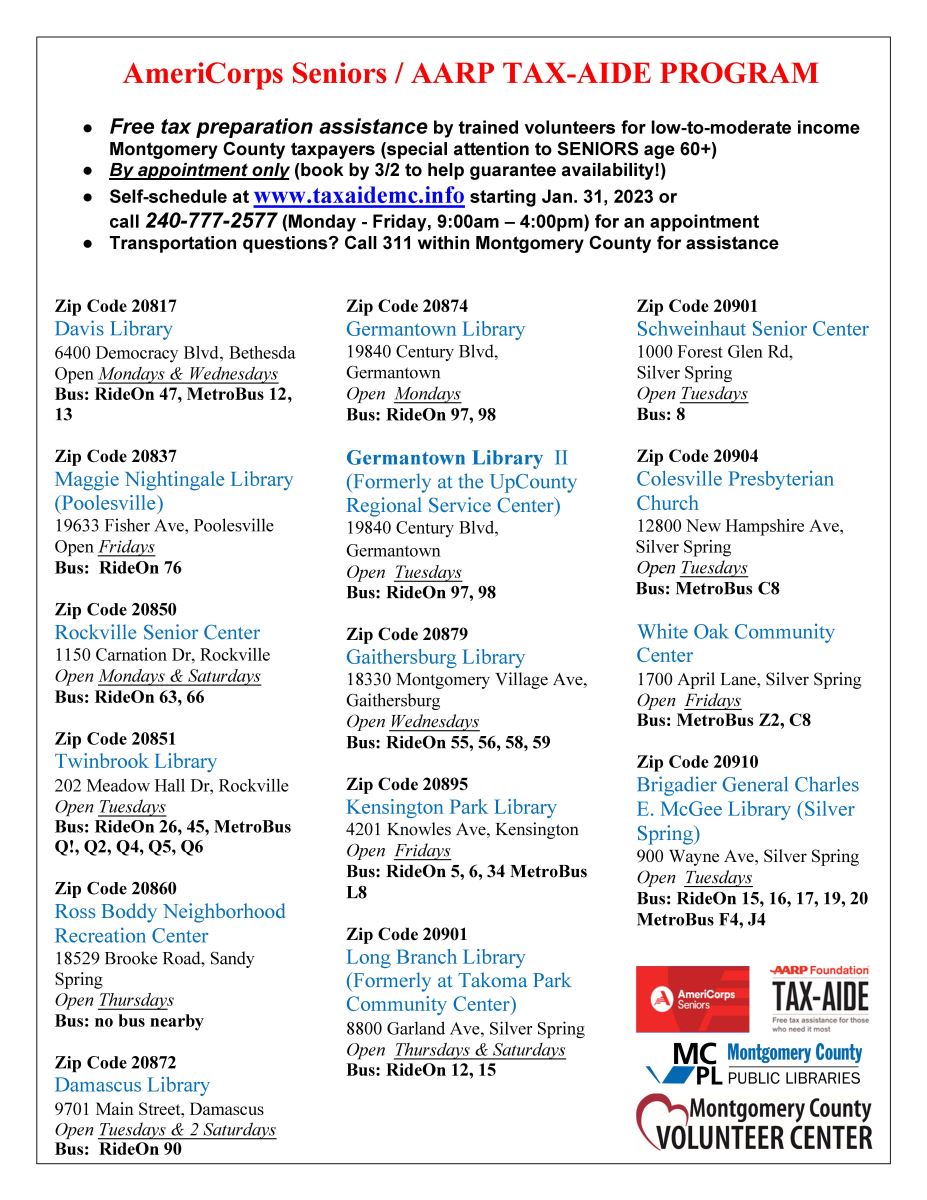 Free tax preparation assistance is offered each year to low-to-moderate-income Montgomery County taxpayers through the AARP Foundation Tax-Aide Program. Services are provided by trained volunteers and are by appointment only. Scheduling for tax appointments will open February 2, 2026.