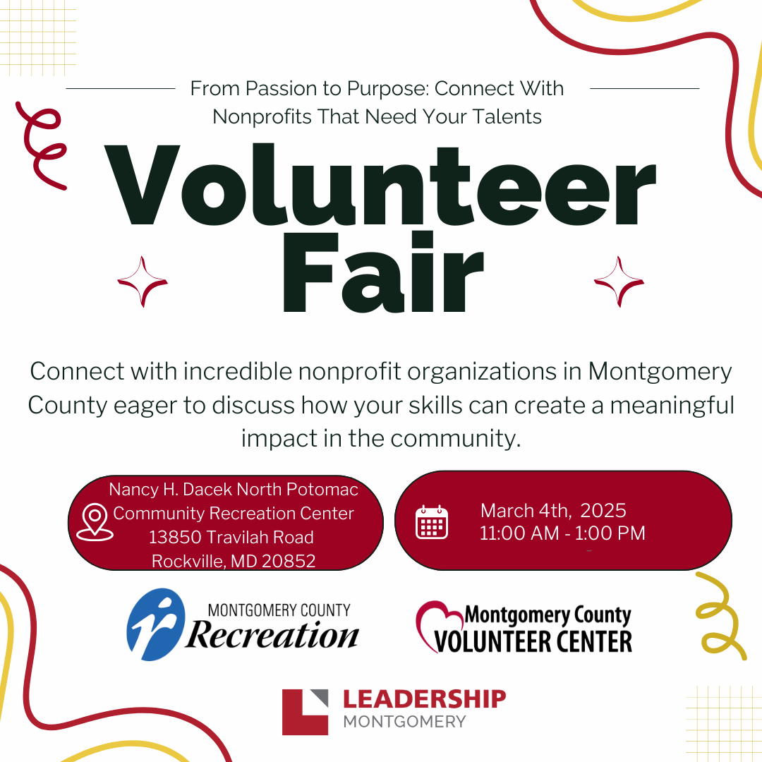 The Montgomery County Volunteer Center has partnered with Leadership Montgomery and the Department of Recreation to provide a volunteer fair to help you find your next meaningful volunteer opportunity. Browse displays from local organizations, chat with volunteer coordinators, and learn about opportunities to get involved in your community! Help us create a stronger, more united community by lending a hand and making a difference. We can't wait to see you there!